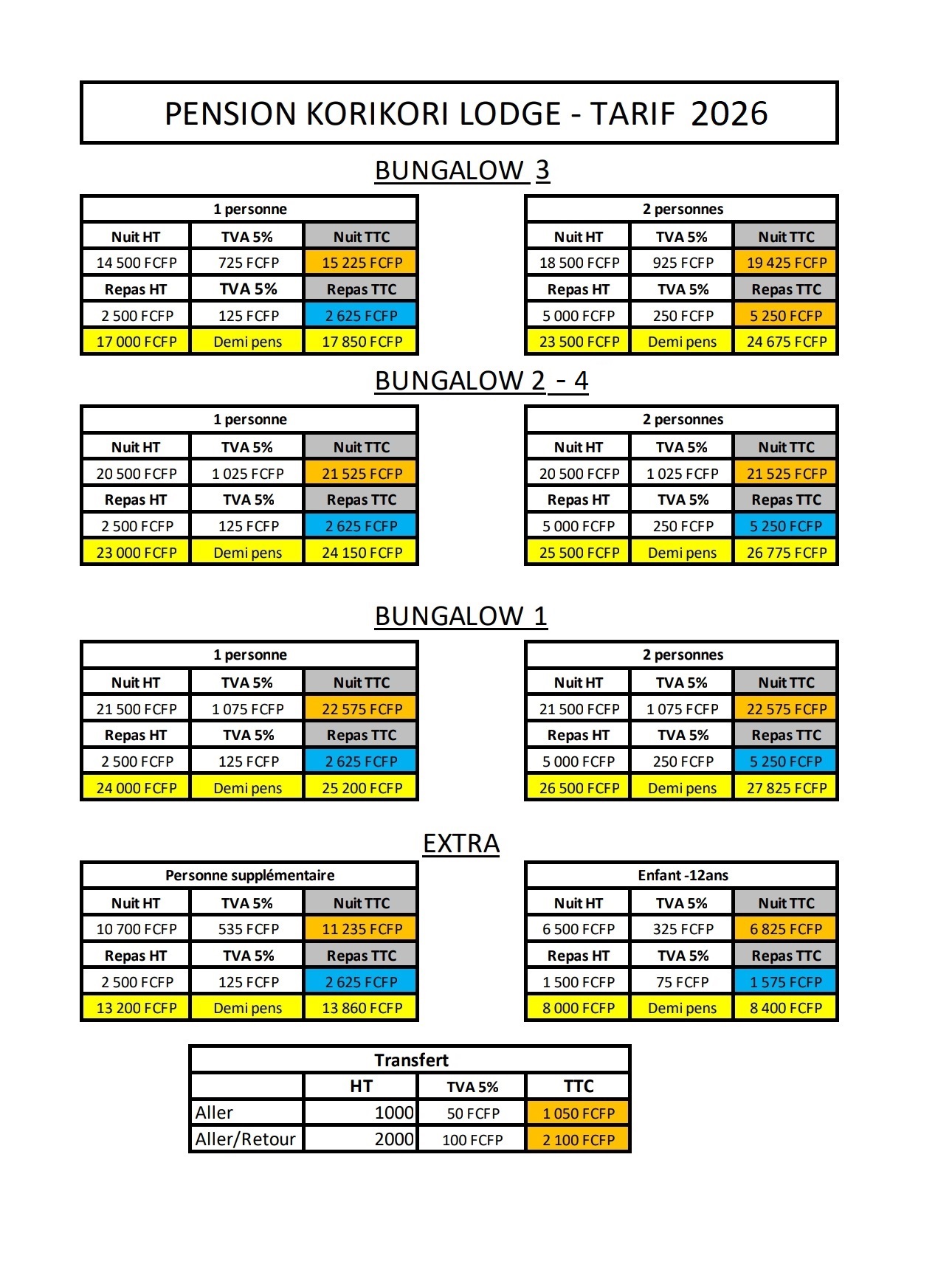Tarif 1 nuit : Tarif du bungalow + 10 000 FCFP
